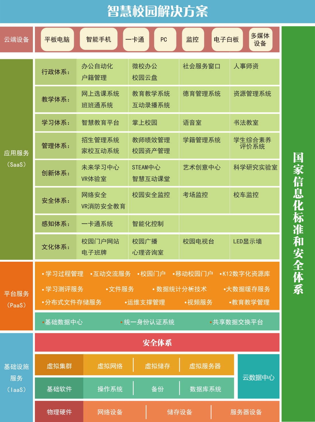 通過建設(shè)智慧校園平臺(tái)提高學(xué)校教育的信息化水平,并探索如何促進(jìn)基于大數(shù)據(jù)模式下的教育管理與教育教學(xué)實(shí)現(xiàn)形式,逐步解決校園教學(xué)的全向交互、校園環(huán)境的全面感知、校園管理的高效協(xié)同、校園生活的個(gè)性便捷,最終實(shí)現(xiàn)建成完整統(tǒng)一、技術(shù)先進(jìn),覆蓋全面、應(yīng)用深入,高效穩(wěn)定、安全可靠的智慧校園。具體目標(biāo)就是實(shí)現(xiàn)“五個(gè)智慧化”和“一站式服務(wù)”: